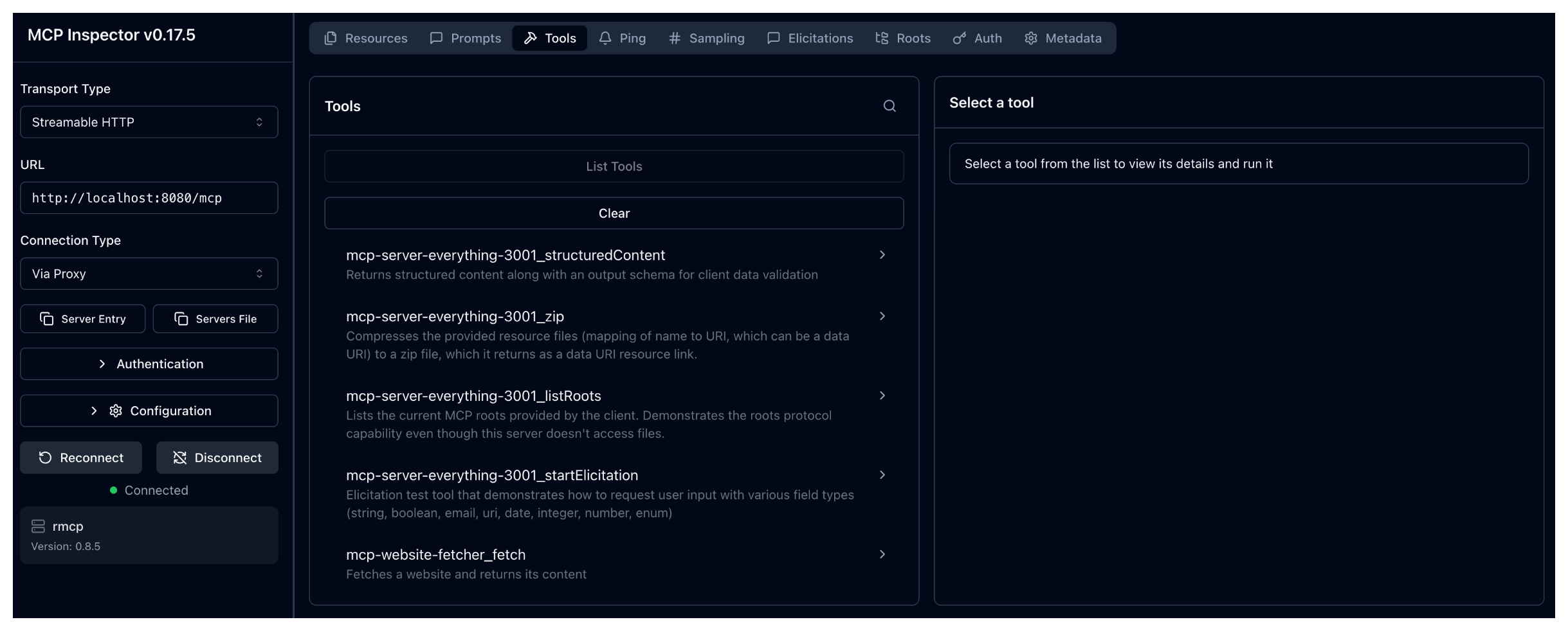 mcp-server-everything-3001_echotool: Click List Tools and select theechotool. In the message field, enter any string, such asHello world, and click Run Tool. Verify that your string is echoed back. - Test the